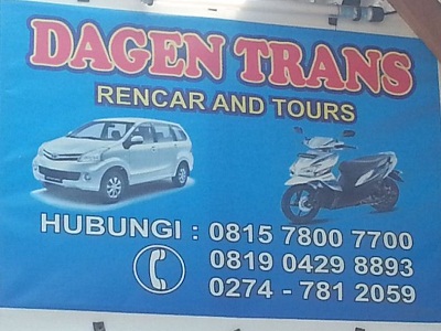 Dagen Transport adalah Perusahaan jasa layanan persewaan mobil terpercaya di Yogyakarta. Dengan tarif dan kualitas terjangkau. Kami menyediakan Armada baru berbagai merk dengan kondisi prima serta layanan sopir berpengalaman yang akan mengantarkan anda menikmati tujuan wisata yang anda inginkan. Kami menyediakan pilihan paket dengan berbagai jenis armada dengan harga yang bervariasi, di antaranya ; AVANSA - XENIA - APV Rp. 450.000,- / 12 Jam, INNOVA - LUXIO Rp. 550.000,- / 12 Jam, TREVELLO - ELF Rp. 700.000,- / 12 Jam. Harga tersebut sudah termasuk Driver+BBM. Kami siap membantu Anda ! Contact Person : 085729722266
